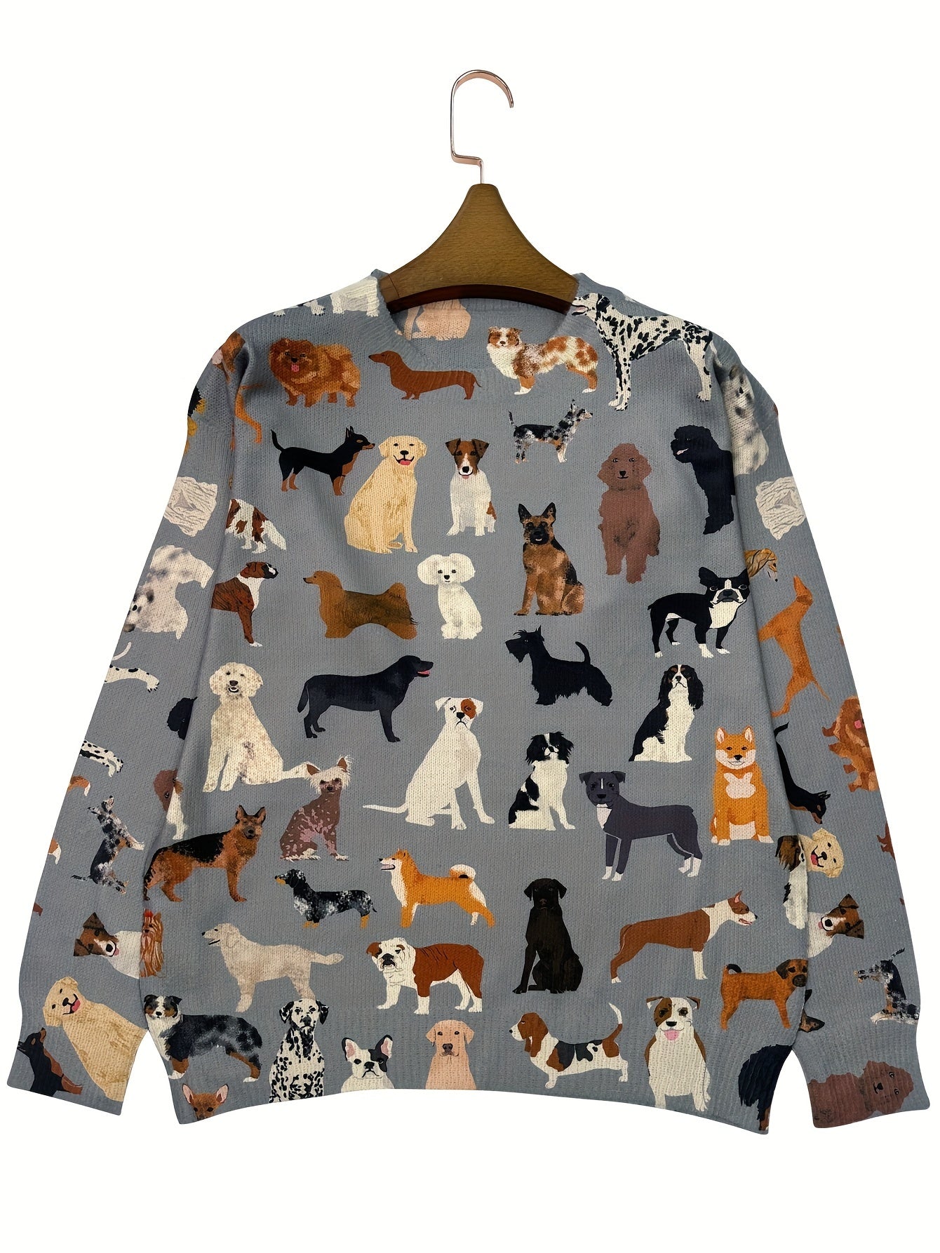 Lightweight Women's Sweater Round Neck Long Sleeves Dog Printed Casual Design